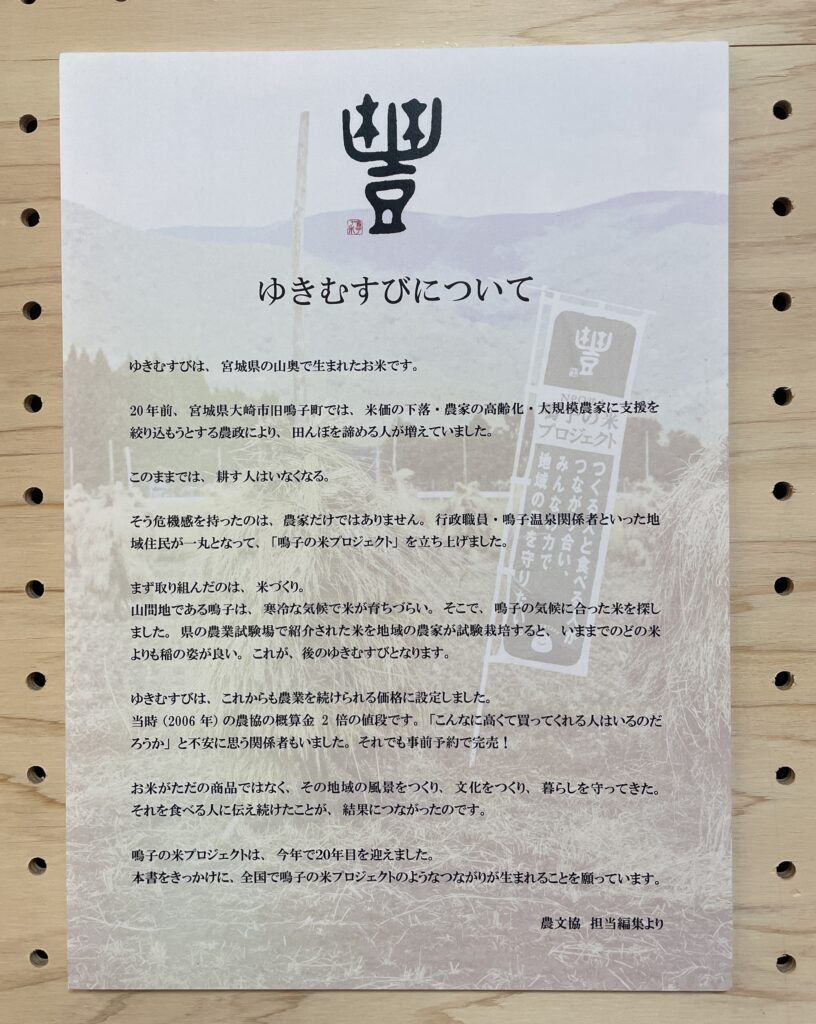 『つながるごはん つくり手と食べ手をむすぶ鳴子の米』(農文協)刊行に合わせ、鳴子の米プロジェクト写真展(寺澤太郎)と、鳴子の米「ゆきむすび」の販売を3月2日までやっています。生産者、消費者ともに安心してつくり続けられ、食べ続けられるお米のありかたとは?そして何よりマジで美味しい「ゆきむすび」を味わっていただきたい。(約2合、550円です)20袋仕入れてあと残り7つ。通常の水の量の85%で炊くのがおすすめです