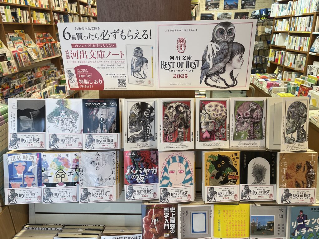 ヒグチユウコさんの特別カバー付きの5点も含め25点。特製しおりをお付けします。6冊買って応募すると、「特製河出文庫ノート」(装画:ヒグチユウコ/ブックデザイン:名久井直子)がもらえるそうですよ!