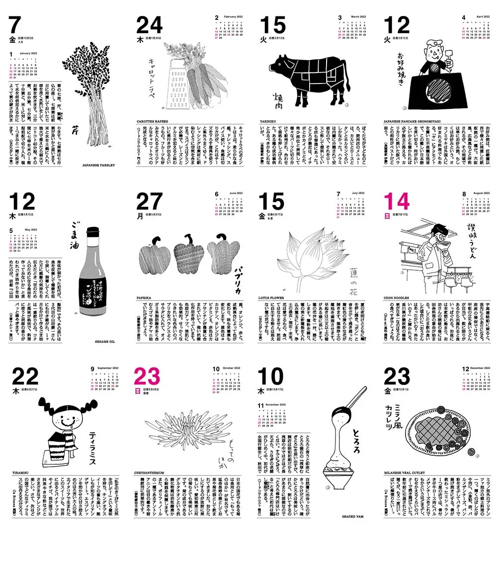 ・ 1日1テーマ、旬の素材や料理を取り上げ、イラストと短文で構成